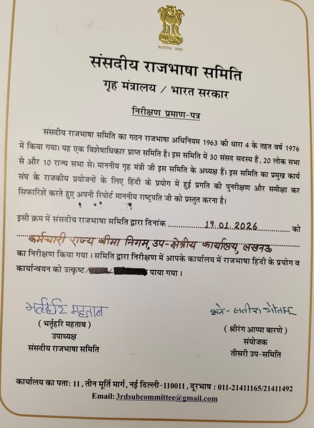 माननीय संसदीय राजभाषा समिति द्वारा किया गया निरीक्षण